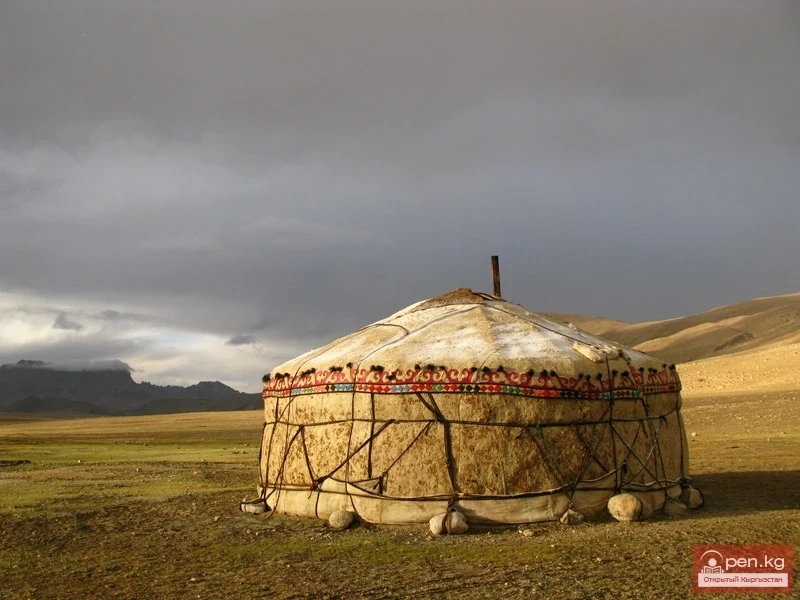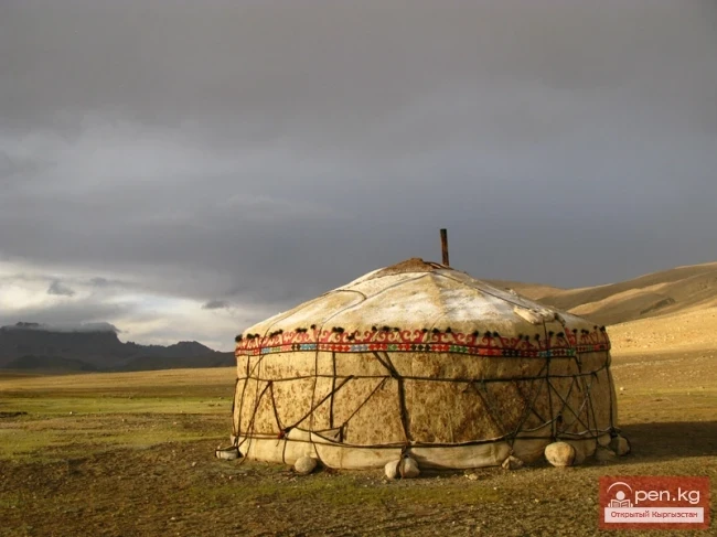 Юрта бедняка киргиза отличалась скудностью внутреннего и внешнего убранства. В ней варили пищу, хранили продукты и посуду, спали всей семьей, принимали гостей, укрывали от непогоды ягнят и козлят.