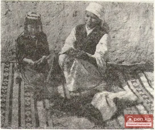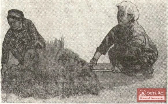 В кочевом быту киргизов шерсть находила широкое применение. Изделия из шерсти и изготовленные из нее материалы использовались для устройства и украшения жилища, одежды, выделки предметов, связанных с верховым и вьючным транспортом. Из шерсти делали арканы циновки и другие предметы домашнего и хозяйственного быта. Наиболее часто употребляли овечью шерсть, использовали козью и верблюжью. Для пряжи, плетения предпочитали шерсть весенней стрижки. Из шерсти осенней стрижки делали войлоки.