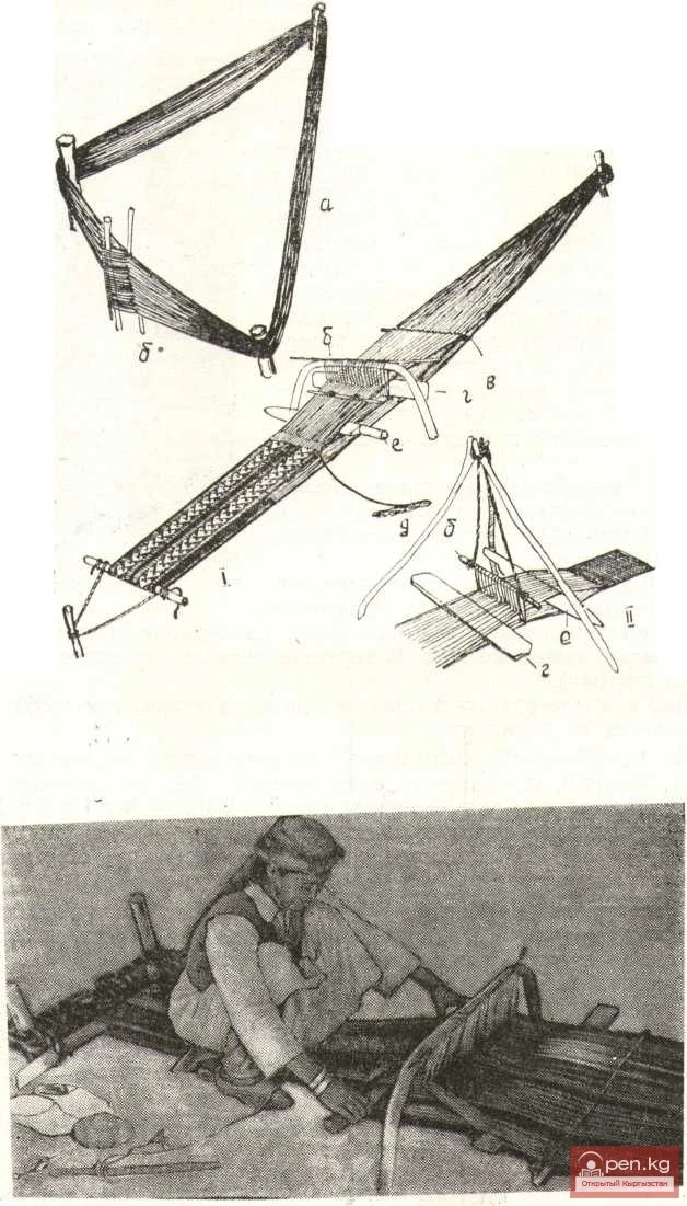 Киргизы пользуются широко распространенным в Средней Азии, Казахстане и вообще на Востоке узконавойным горизонтальным ткацким станком. Достаточное освещение в литературе получили ткацкие станки и других народов Средней Азии и Казахстана. Все они по своему устройству тождественны киргизскому, портативны и удобны для кочевой.