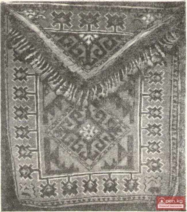 Из предметов, имеющих отношение к верховому и вьючному транспорту, широкое распространение имели ворсовые подпруги (басмайыл), подстилки на седло— копчук (размером 35X40 см), переметные сумы (куржун). Вырабатывали специальные ковровые чехлы для закрывания во время перекочевки концов купольных жердей и звеньев решетчатого остова юрты. Таким образом, в XIX в. ковровые изделия у южных киргизов глубоко проникали в быт.