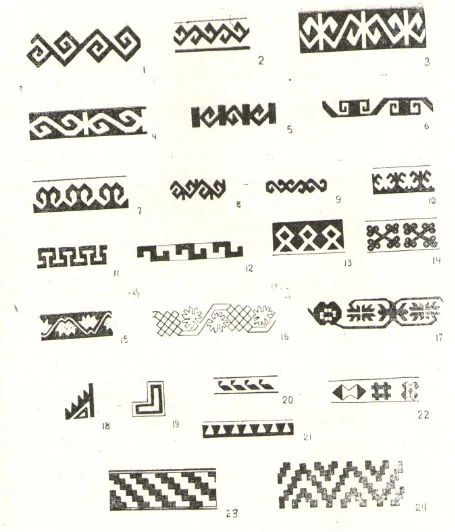 Рис. 47. Образцы орнамента на кайме ворсовых изделий. 1— «сынар муйуз; 2, 5, 8—«ильмек»; 3'—«кош ильмек»; 4, 6, 9, 12—«ит куйрук»; 7—«кайкалак», «кош муйуз»; 10—«багджагай»; 11 — «калит»; 13 — «баш кереге»; 14—«бали-бали»; 15—17 — «гуль кеште»; 18—19 — «пычак учу»; 20—«кыныр моюн»; 21 — «тумарча»; 22 — «ит таман» (в середине), «кёполёк канат» (по краям); 23—24 — «кавырга».
