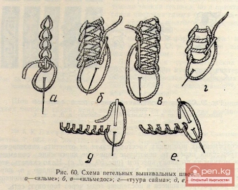 Как и шов «ильме», он древен и тоже отмечен в Кара-Булакском могильнике Баткенского района. Встречается этот шов в двух вариантах: нити располагаются прямо, т. е. под прямым углом к кромке (рис. 60, д), или косо, т. е. наклонно к ней (рис. 60, е).