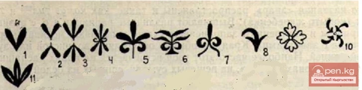 Трилистник часто сопровождается двусторонними завитками, направленными своими закруглениями в разные стороны вниз (рис. 65, 5—7). Завитки эти принято называть, как на войлочных и тканых изделиях, «кочкор муйуз» («кайкалак»),