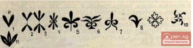 Остановимся на основных наиболее распространенных мотивах вышивок. В развитии вышивального искусства значительное место заняли мотивы в виде двух, трех отростковых разветвлений с общим основанием. Условно мы их называем двулистник, трилистник (рис. 65, 1—4, 7— 8, 11), как уже отмечалось при анализе узора на войлочных коврах «ала кнйиз». Мотивы эти прослеживаются на старинных и современных вышивках и имеют широкое распространение на территории Киргизии. Помимо вышивок, они применяются в аппликациях, в войлочных изделиях, на плетеных циновках из чия, на ворсовых изделиях, а также при орнаментации серебра.