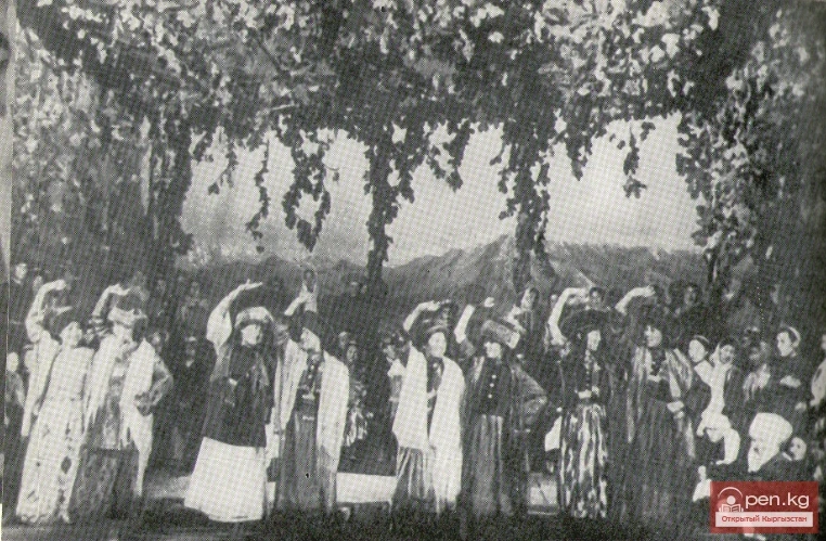 Одновременно с учебой группы молодежи в Ленинградском хореографическом училище в довоенный период шла подготовка артистов; балета во Фрунзе. По мере того, как развивался киргизский танец — от эпизодического в музыкальной драме до цельного, развернутого балетного представления — росли и актерские кадры. Достаточно сказать, что если в первом киргизском музыкальном спектакле «Алтын кыз» принимало участие 6 юношей и девушек, то уже через год, т. е. в 1938 году, при театре существовала балетная группа в 70 человек. И все они «с огромной любовью и упорством изучали сложное искусство танца».