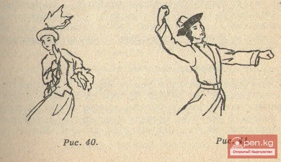Пауза. Правую ногу опустить на пол. Правую руку раскрыть чуть ниже 2-й позиции, как бы продолжая держать на нитке вращающееся веретено.