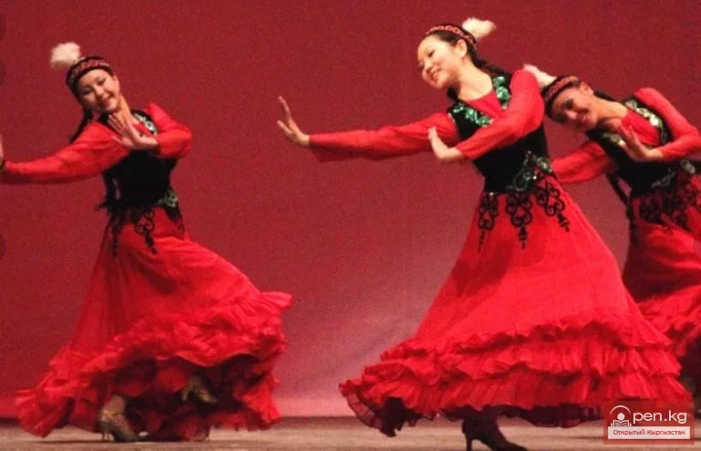Другой вид движений рук связан с игрой на комузе, с имитацией движений музыканта-виртуоза. Здесь для исполнителя простор для импровизации. И если мужской танец характеризуется движениями сильными, размашистыми, то для женского танца главное — мягкость, певучесть движений рук и переходов, игра руками.
