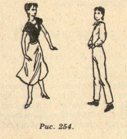 два Передать тяжесть корпуса на правую ногу, пятку левой ноги оторвать от пола. Наклоняя корпус в разные стороны, танцующие смотрят друг на друга (рис. 254).