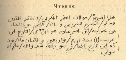 Сфотографирован и эстампирован памятник нами в 1974 г. Просмотревший несколько лет тому назад прорисовку текста В. Настич отмечал, что надпись страдает многими ошибками, чувствуется большое влияние персидского языка. Тогда же он предложил предварительный перевод эпитафии. Недавно по нашей просьбе В. Настич еще раз просмотрел фотоснимок и прорисовку надписи и внес некоторые уточнения в ее чтение и перевод.