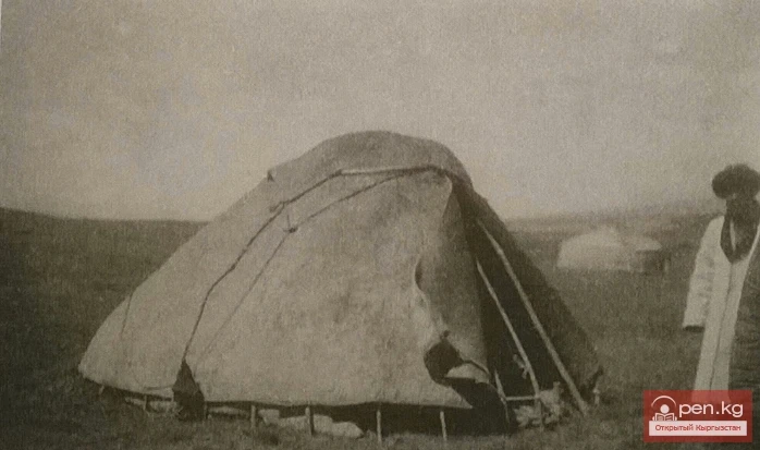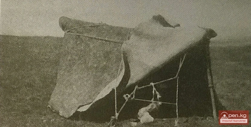 Саймалачик - круглая низкая палатка, составленная из ууков и тундука и покрытая кошмами как верх юрты. Летовка в долине р. Арпа. Чештю-бинская вол., Нарынский уезд, Семиречье, 1924 г.