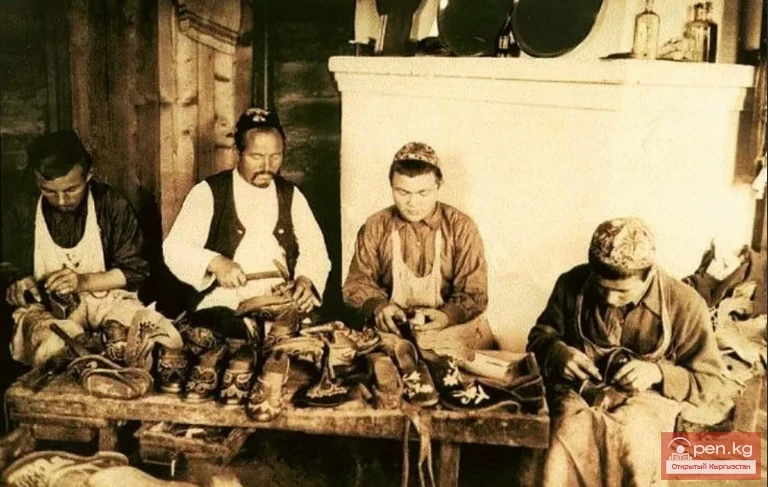 Обработкой шкур и кож занимались - летом при помощи острого ножа, заостренной палочки; при шитье применяли сухожильные нити, конский волос. Кожаные сосуды и сумки коптили в вырытых в земле ямах-коптильнях (ыштык, ыстадым). Украшали изделия тиснением, аппликацией из цветной кожи или ткани, прошивкой цветными нитками, металлическими лентами, накладными металлическими бляшками или пластинками, декоративными гвоздями со шляпками, узорами, нанесенными чеканкой (Айтбаев, Иванов, 1968. С. 125, 126).