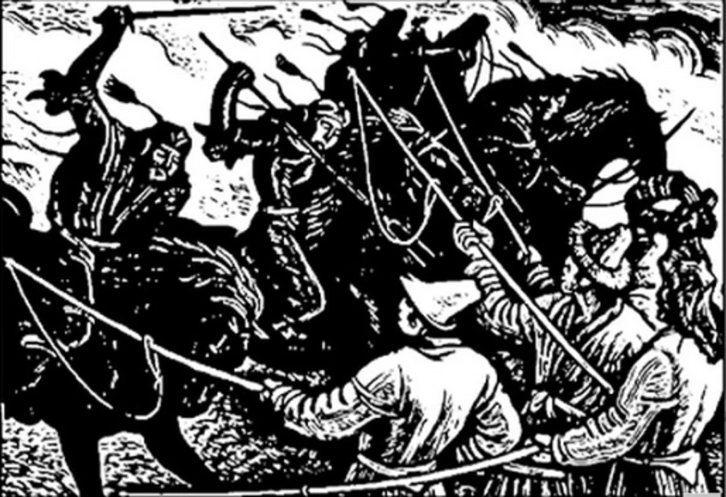 Разъярившись, великан в свою очередь, не долго думая ударил коня своего плетью, догнал Семетея и нанес ему несколько ударов секирой. От удара секиры Семетей потерял сознание, а из глаз его посыпались искры.