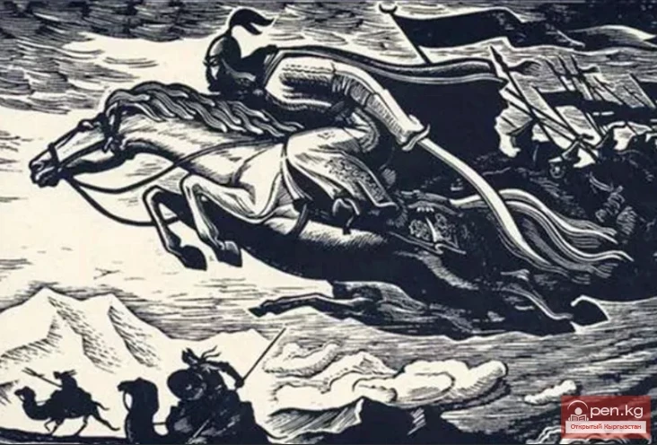 Так в гневе отвечал Кошою Манас и, громко ударив в боевой акдоол, стукнув по земле своим аккельте, вскочил на коня и помчался в бой с китайцами.