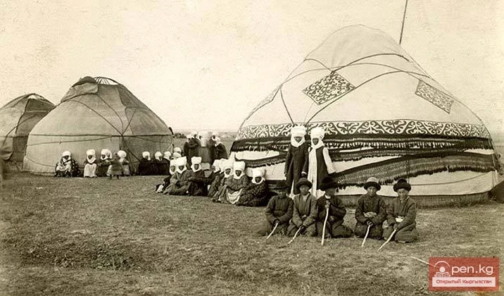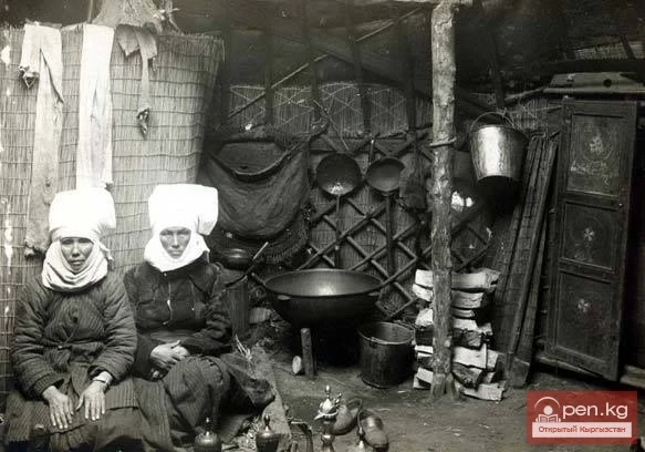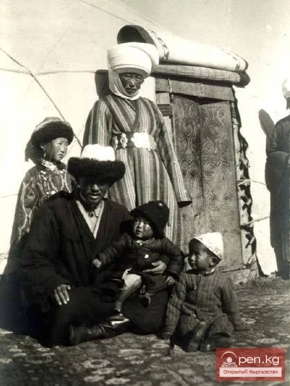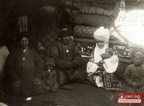 Отношения в киргизской семье строились на патриархальной основе. Глава семьи считался распорядителем всего имущества и судьбы своих детей. Положение женщины в семье, как и в обществе, было неполноправным. Выкуп — кун — за убийство или увечье женщины уплачивался в половинном размере. Женщина не могла быть, за редким исключением, свидетельницей на суде. Она не обладала имущественными правами и фактически была лишена права наследования. После смерти мужа или отца женщина расценивалась как часть имущества, переходящего к родственникам мужа или братьям. При разводе дети должны были оставаться у отца. В то же время женщина являлась главной рабочей силой в семье, выполняя все работы по ведению домашнего хозяйства, воспитанию детей, уходу за скотом, изготовлению одежды и утвари. Все это тяжелым бременем ложилось на киргизскую женщину и приводило ее к преждевременной старости. Такие обычаи, как выдача замуж малолетних, калым, многоженство были унизительными для киргизской женщины, низводили ее до положения рабыни.