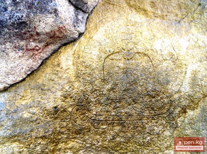 Камень с изображением Будды располагается выше источника. Люди верующие полагают, что его очертания не всякому глазу современного зрителя доступны и понятны. Однако главное в изображении сохранило чистоту и ясность: Благословенный Будда, восседающий на лотосе и обрамленный кольцом Беспредельности, предстает из глубины веков для взора посетителей источников! Будду и пять слабо заметных тибетских надписей художник разместил на плоскости размером 120x113 см. Будда представлен в традиционной для буддийской иконографии позе — сидящим на лотосе.