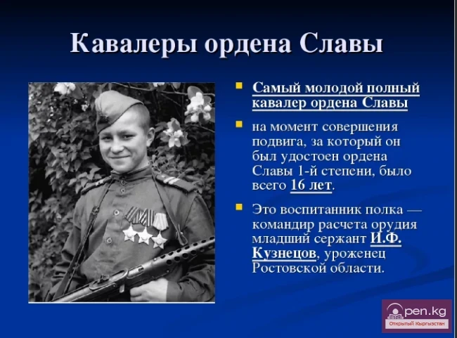Самым молодым полным кавалером ордена Славы стал младший сержант Иван Кузнецов. В 16 лет его представили к ордену I степени. Таких юных героев насчитывается всего 47.