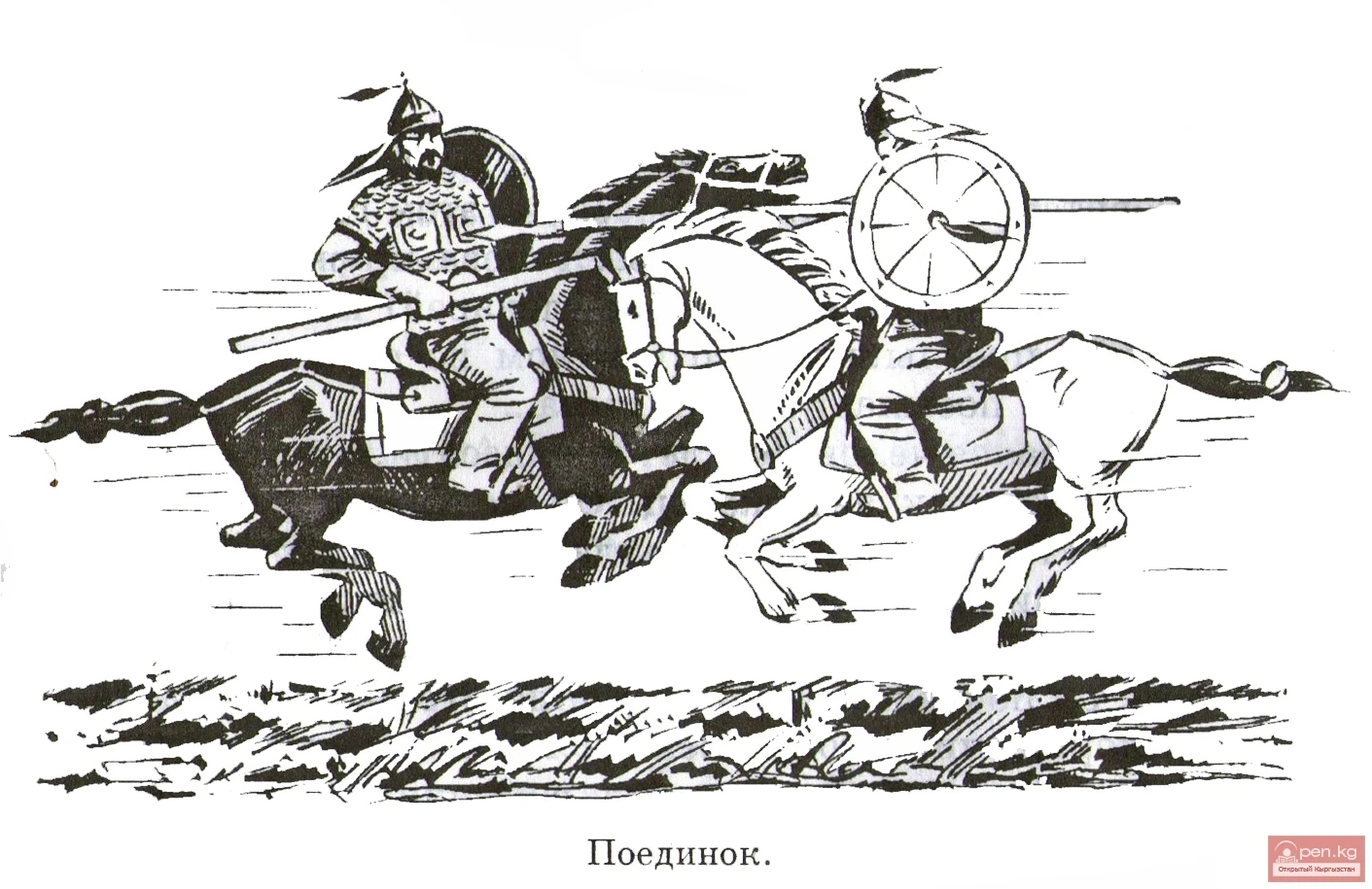 Но вот с красного отрога заухал по-совиному Токчоро, подавая сигнал к нападению. Это был удобный момент: начало растянувшегося на несколько километров обоза оказалось с запад-ной стороны отрога, а конец — с юго-восточной; замыкающая обоз охрана не слышит и не видит, что делается впереди. С боевым кличем “Тайлак! Тайлак!” джигиты пустили коней вскачь. Тайлак батыр направил коня прямо к возглавлявшему обоз заместителю бека — Назару, широко известному жителям обоих берегов Нарына своим нахальством и жестокостью. На его совести было немало грязных дел — издевательство, насилие над беззащитными. Тот просто оторопел, когда увидел мчавшегося на него в сверкающих доспехах на огромном гнедом коне грозного, подобно льву, Тайлак батыра. “Поединок!” — только и смог разобрать он. Душа Назара ушла в пятки, но деваться было некуда, и он, хлестнув камчой скакуна, выехал вперед. Держа копье в правой руке, он ринулся на Тайлака. Мощный удар Тайлака пришелся Назару в ключицу. Копье не пробило латы, но Назар, не удержавшись в седле, рухнул наземь.