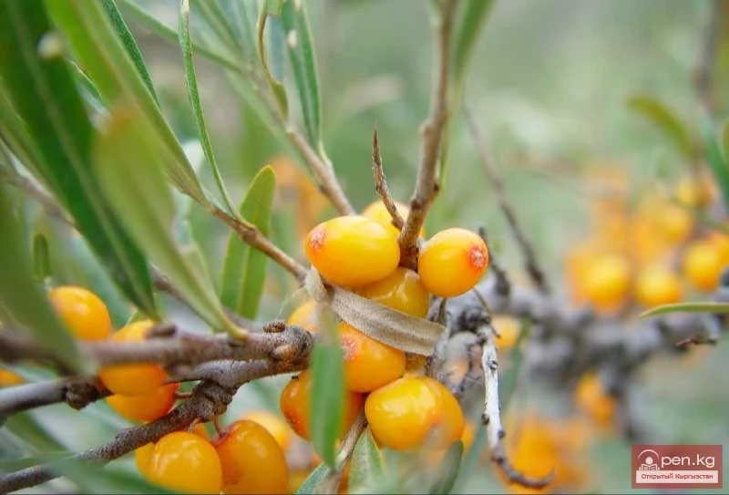 Удивительное растение-облепиха! В Киргизии она широко распространена не только по побережью озера Иссык-Куль, но и почти во всех районах по берегам рек, образует густые труднопроходимые заросли, которые местные жители называют чычырканак. Растет по берегам рек. Это растение двудомное: мужские и женские цветы находятся на разных кустах. Оранжевые кислые плоды с привкусом ананаса густо облепляют веточки кустов - отсюда и название растения. Наиболее распространена в пойме реки Чу и на побережье озера Иссык- Куль. Масло, получаемое из сока облепихи, считается целебным, способствует быстрому заживлению ран. Плоды облепихи содержат каротин, яблочную и другие органические кислоты (до 2,7%), сахара (до 3,5%), дубильные вещества, витамины С, В2, Е и другие. Она широко применяется в медицине. Особенно ценится облепиховое масло, получаемое из плодов. В настоящее время облепиха занесена в Красную книгу и охраняется законом.