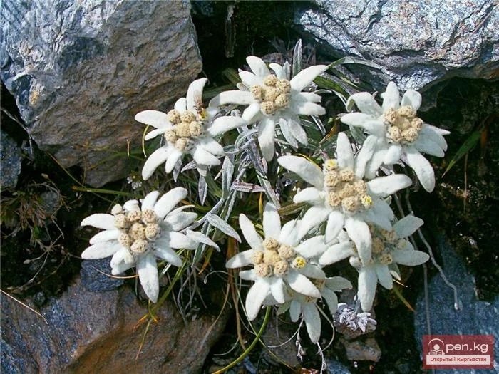 Эдельвейс - высокогорное растение, встречающееся на высоте более 2000 м. Может быть поэтому этот необычный цветок серебристого цвета выбран символом альпинизма и высокогорья. Эдельвейс широко распространен в Кыргызстане. Огромное количество эдельвейсов расцветает на пространствах вокруг моренных озер под пиком Ленина. Необычно крупные эдельвейсы встречаются в Джеты-Огузе и в районе озера Сон-Куль.