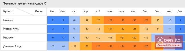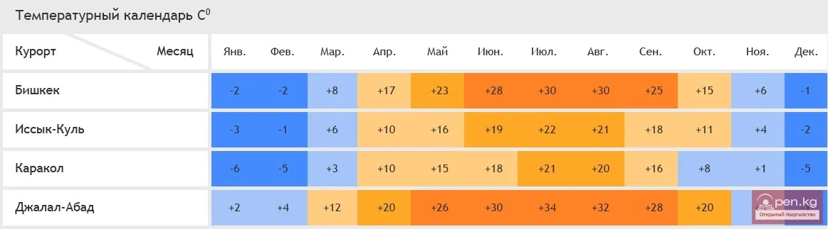 Особенности климата Киргизии объясняются тем, что страна фактически расположена на стыке нескольких поясов. Большая часть территории находится в умеренном поясе сухого типа, часть предгорий – резко континентального климата, а высокогорные районы имеют схожую с тундрой картину зимних температур. С точки зрения туризма, Киргизия – это курортная зона полного цикла, где в каждом месяце можно отдыхать и наслаждаться природой.
