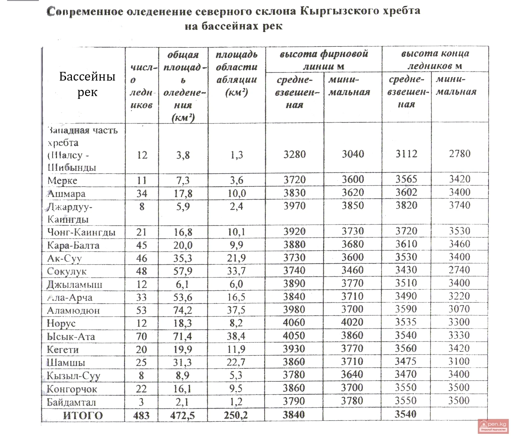 Оледенения по бассейнам рек Кыргызстана