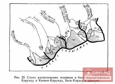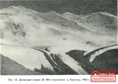 Река Корумду является притоком р. Сарыджаза и в верховьях делится на две ветви; Чон-Корумду и Кичине-Корумду. В бассейне р. Кичине-Корумду сосредоточено всего пять ледников. Однако площадь оледенения здесь больше, чем в бассейне р. Чон-Корумду, и равна 12,1 км2. Из них 9,9 км2 приходится на долинный ледник № 180, занимающий обширный цирк с многокилометровой фирновой областью (рис. 15).