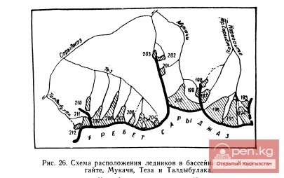 Для полного представления об оледенении района верховьев р. Сарыджаза приведем краткие характеристики оледенения по бассейнам рек-притоков.