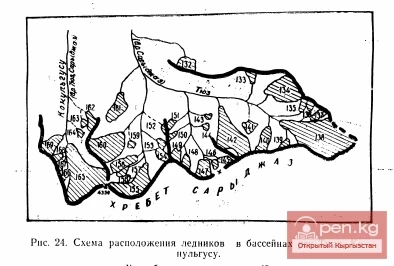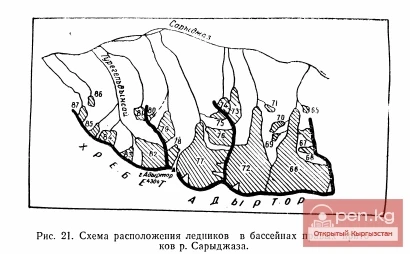 Бассейн верховьев р. Сарыджаза (ледники № 38—81).