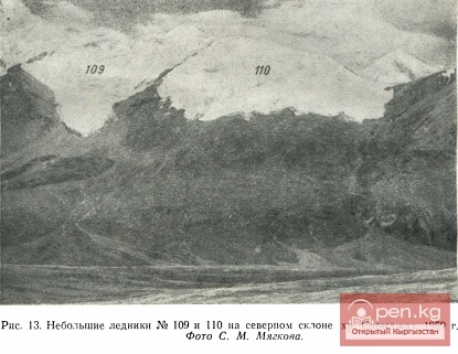 Такой же характер питания и такую же морфологию имеют и другие долинные и карово-долинные ледники левых притоков р. Адыртора вплоть до впадения в него р. Ачекташсу. Многочислены также малые формы оледенения — висячие и каровые ледники (рис. 13).