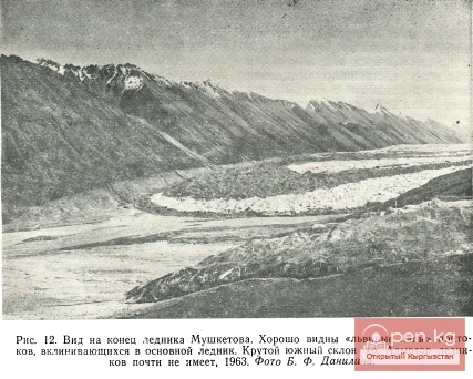 Мушкетова ледников совсем не имеет (рис. 12). Фирновая область ледника располагается в огромном цирке с крутыми и высокими полуторакилометровыми бортами в месте соединения хребтов Адыртор и Сарыджаз. Несмотря на незначительный уклон (5—6°), ледник Мушкетова, как и ледник Семенова, имеет неровную бугристо-западинную поверхность, рассеченную многочисленными трещинами. Система поверхностных морен четко выражена только в верховье ледника, в нижней части эта четкость теряется в результате недавнего надвигания ледника. Ледник Мушкетова относится к типу пульсирующих ледников, для которых характерны катастрофические подвижки. Левым край ледника несколько выше правого, в результате чего самый нижний приток (ледник № 100) не плавно вливается в тело ледника, а упирается в его край и фактически не участвует в питании. Основную долю питания ледник и его притоки получают за счет лавин. Притоки разбиты многочисленными фирнопадами и ледопадами и круто падают к главному леднику. Конец языка ледника Мушкетова оканчивается на высоте 3440 м и конечно-моренного вала не имеет.