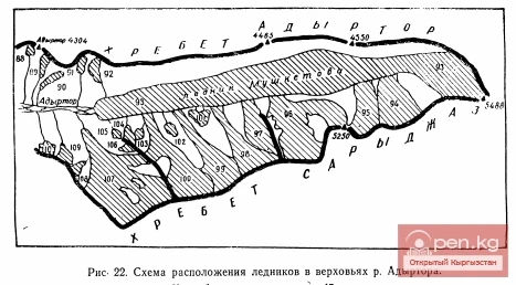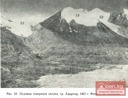 Для западной части северного склона хр. Адыртор характерны крупные долинные и карово-долинные ледники, а также ледники висячих долин (№ 61—81).