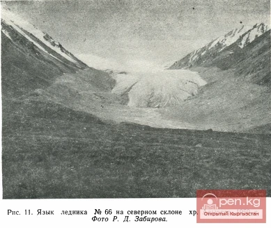 Основной фон оледенения составляют сравнительно крупные ледники долинного типа, достигающие длины 5—7 -км (рис. 14). Ледники, спускающиеся со склонив хр. Сарыджаз, похожи на ледники бассейна верховий р. Адыртора, а ледники, расположенные в отрогах хребта, аналогичны долинным ледникам северного склона хр. Адыртор.