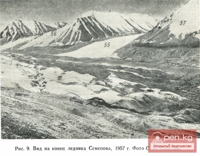 Справа, со склонов хр. Терскей-Алатау в ледник Семенова впадают два притока (ледники X» 45, 46) общей площадью 5,3 км2. Главная же масса льда поступает из пяти левых притоков (ледники № 47, 49, 51. 53, 55). Они стекают с хр. Адыртор и при слиянии с главным ледником образуют на его поверхности моренные валы (рис. 9). Левые притоки довольно крупные, длина их достигает 3—4 км. Одной из особенностей ледника Семенова считалось наличие в приконцевой части 5—6-кило¬метровой «мертвой зоны».