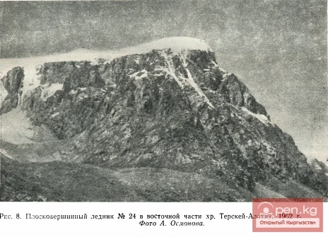 Расчлененность хр. Терскей-Алатау в пределах бассейна в связи с возрастанием абсолютных и относительных высот значительная, что обусловливает разнообразие морфологических типов ледников. Самыми крупными являются ледники долинного типа — Кейделя (3,6 км2), Тынай (2,3 км3) и Байгазы (4,4 км2), на долю которых приходится 75% всей площади оледенения бассейна. Каровые ледники по размерам незначительны, залегают в глубоких карах южной и юго-западной экспозиций. Они занимают лишь внутреннюю часть вместилищ и окружены голыми склонами. Питание их осуществляется либо за счет непосредственного накопления снега на поверхности ледника, либо за счет метелевого переноса. Склонового питания они не имеют. Для пригребневых участков характерны мелкие снежники и висячего типа ледники, которые расположены как с наветренной западной, так и с подветренной восточной стороны. На западе бассейна имеется типичный для выровненных водоразделов ледник плоских вершин № 24 (рис. 8).