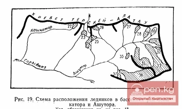 Между бассейнами рек Кашкатора и Ашутора расположен небольшой переметный долинный ледник № 23. Он является меньшей частью другого долинного ледника, который по сквозной долине, прорезающей хр. Терскей-Алатау, спускается в сторону Казахстана и является истоком р. Туюкаша (р. Текес).