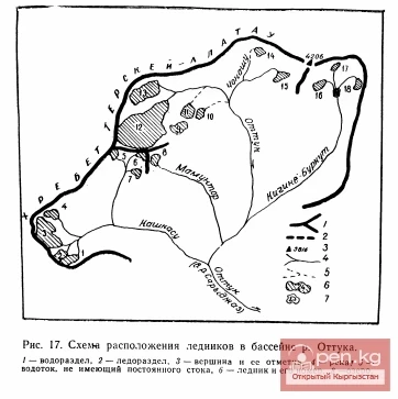 В бассейне р. Оттука, самом западном на южном склоне хр. Терскеи-Алатау, сосредоточено 18 ледников общей площадью 9,4 км2. К западной части бассейна, где отметки главного водораздельного хребта достигают высот 4300—4400 м, приурочена большая часть ледников. Они представлены долинными и карово-долинными типами. В восточной части бассейна, где хр. Терскей-Алатау постепенно понижается и высоты его не превышают 4200 м, преобладают небольшие ледники висячего типа, площади которых не превышают 0,3 км2. В бассейне широко представлены мелкие ледники и снежники площадью менее 0,1 км2, приуроченные главным образом к бассейнам рек Мамунтора, Чонашу и Кичине-Буркут. Пригребневое расположение ледников, северо-западная, благоприятная к господствующим ветрам ориентировка хребта, сравнительно высокое количество осадков (600—700 мм) - все это способствует существованию здесь небольших ледников. Бассейн характеризуется довольно высоким ледниковым коэффициентов (2,1),