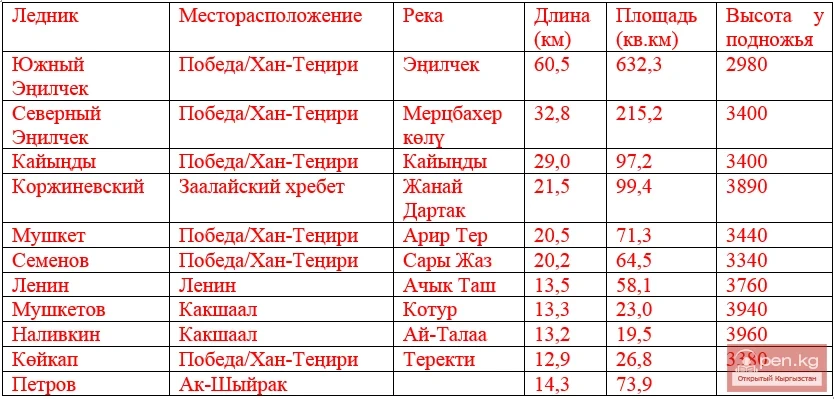 • Кыргызский хребет: Имеет 607 ледников площадью 530,4 км2.