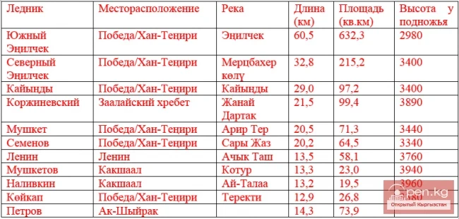 К сожалению, приведенные данные на сегодняшний день, могут не соответствовать действительности, так как они еще советского периода. Реестр ледников не актуализируется и соответственно действенный мониторинг ледников не проводится.