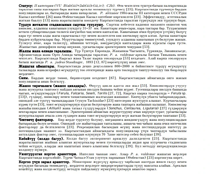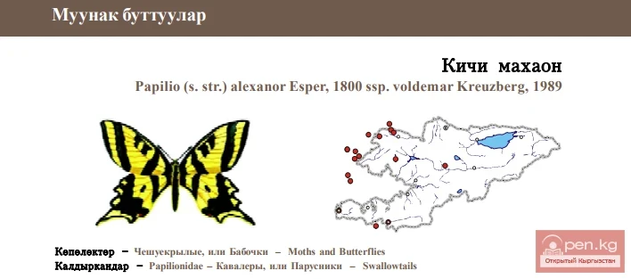 Status: Vulnerable (VU Blab (iii)+2ab(iii)c(iii, iv); C2b - Category II), local West Tien Shan subspecies of mosaic- distributed wide-spread noticeable large butterfly, which species and subspecies are included into some regional Red Lists. It is one of two congeners in Kyrgyzstan and has aesthetic value and scientific zoogeographical importance and for preservation of regional genetic fund. Butterflies occur in June on stony and clayey low-montane slopes with steppe vegetation and Umbelliferae plants, at 800-2,000 m above sea level. Number is small everywhere. Limiting factors: excessive pasturage and endoparasitoids. At present it is out of any protection, but degree of anthropogenic distur¬bance of habitats is not critical. Monitoring in created micro-reservations, study of the reproductive ability and forage reserve and possibilities for stabilisation of populations including the introduction are necessary for conservation of the species.