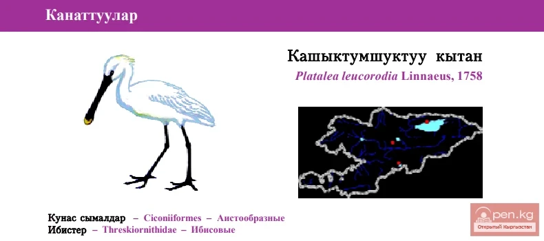 Статус: VIкатегория, Near Threatened, NT: R. Единственный представитель рода в Кыргызстане. Пролетает номинативный подвид Platalea leucorodia leucorodia Linnaeus, 1758.