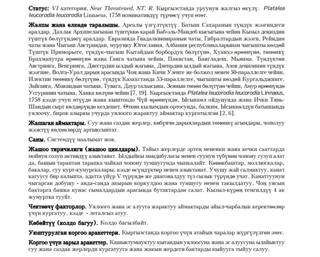 Status: VI category, Near Threatened, NT: R. Rare migrant and wintering bird in Chu Valley, Issyk-Kul Region, highland lakes of Inner Tien Shan. Probably nested in the past in the western part if Issyk-Kul Lake, because there was registration of adults with fledglings in one of the bays. Nowadays those habitats are drainaged and cultivated, Spoonbill has not been seen around. Current numbers are unknown. In all occasions only single birds were observed. Usually flocks fly in V-formation or in diagonal single lines. Uses tadpoles, frogs, mollusks, water insects and vegetable matter for food. Builds massive stick nests on trees together with other heronry. Lays 4 white eggs, spotted with deep reddish brown.