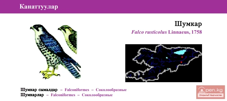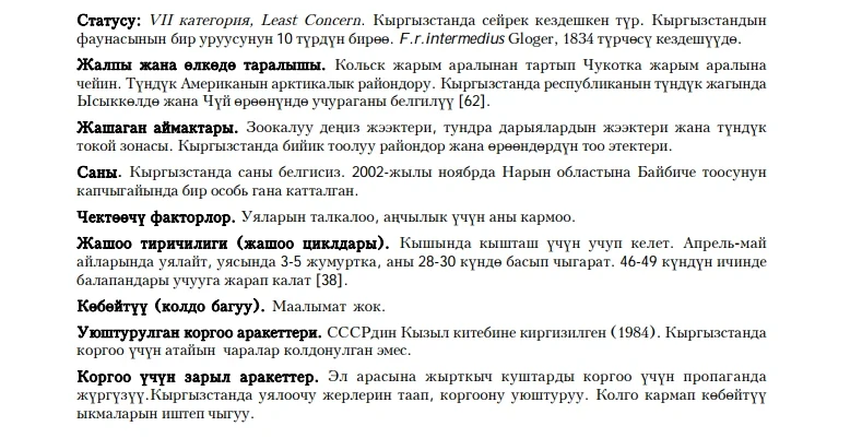 Status: VII category, Least Concern. Seen in Chu Valley and Issyk-Kul, Naryn Regions. No data on numbers are reported. Only one bird was observed in Baibiche Gorge of Naryn Region. Rare winter visitor. Nests in April-May, lays 3-5 eggs, and incubates for 28-30 days. Juveniles leave nest in 46-49 days. Limiting factor is capture for falcon hunting purposes, nest destruction is another one. No data on captivity holding. Included into USSR Red Book of 1984, special protecting measures in Kyrgyzstan were not undertaken. It is proposed to conduct public awareness campaigns, identify possible nesting sites and organize protection of those nests.