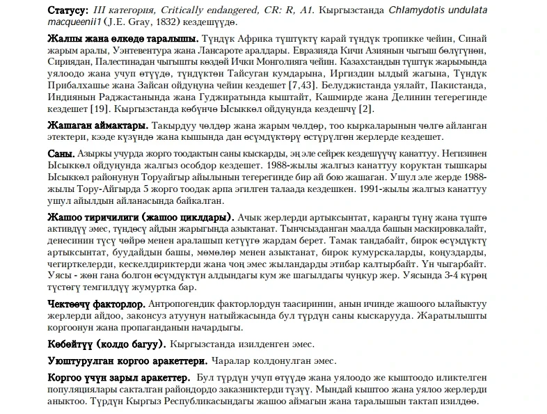 Status: III category, Critically Endangered, CR: R, A1. Prefers deserts and semi-deserts of Issyk-Kul oblast during migration and winter time. Data on numbers are irregular and scarce. A single bird was recorded feeding for a month near Toru-Aigyr village in 1988; another group consisting of 5 birds was seen not far from that place in the agricul¬tural fields. One Houbara Bustard was recorded in the place in 1991. Uses for food field crops, cherries, can eat ants, beetles, lizards etc. Nest is a depression in sand or stones under existing scarce vegetation. Lays 3-4 eggs. Limiting factors are ploughing up desert and semidesert habitats, illegal poaching, law quality of protection management and low public awareness. No captivity holding is known. There were no special protection measures in Kyrgyzstan. It is recommended to establish protected areas in the natural habitats with high concentration of the species populations.