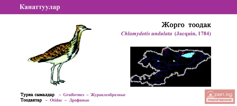 Статус: III категория, Critically Endangered, CR: R, Al. В Кыргызстане обитает Chlamydotis undulata macqueenii (J.E. Gray, 1832).