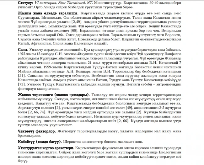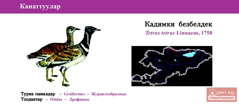 Status: VIcategory, Near Threatened, NT. Monotypic species. Most probably, does not breed in Kyrgyzstan for the last 30-40 years. In the past bred in Suusamyr Valley, Issyk-Kul Region, Talas and Chu Valleys, as well as in Fergana Valley. Extremely rare during migration period in Chu Valley and Issyk-Kul oblast. Prefers steppe zones with scarce vegetation. Information about numbers is scarce. Seven birds were seen in agriculture field near Djangi-Djer village 20 years ago, 1 bird - in 1999 near border with Kazakhstan. Little Bustard is very shy bird. Arrives in April, nests on ground, and lays 3-5 eggs. Uses for food insects but does not ignore vegetation matter as well. Limiting factor is ploughing up suitable habitats, overgrazing and poaching. Hunting was prohibited in the USSR. It is recommended to study biology of the Little Bustard, try to breed it in captivity and re-introduce them back.