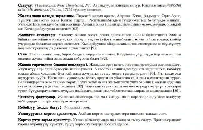 Статус: VI категория, Near Threatened, NT. Вид с низкой численностью, малоизученый. В Кыргызстане обитает подвид Pterocles orientalis arenarius (Pallas, 1775).