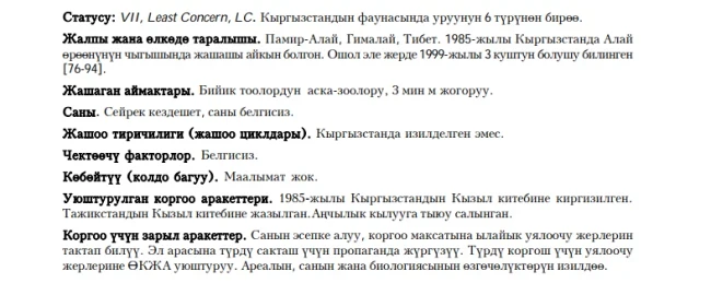 Status: VII, Least Concern, LC. Occurs in Pamir-Alai Mountainous System. Prefers rocky habitats in highlands. Rare species, no data on numbers and nesting biology are available. There is no also information on limiting factors and breeding in captivity. Included in Kyrgyz Red Book of 1985. It is recommended to research and identify area, numbers and nesting biology of the species.
