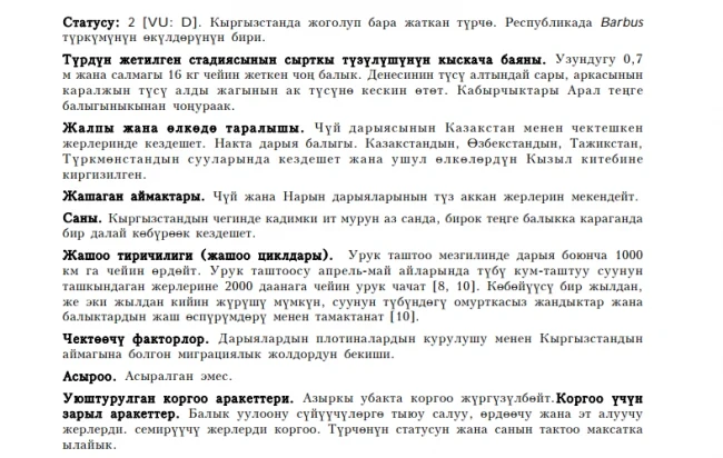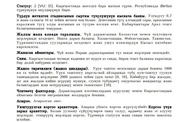 Status: Category 2 [VU: D], endangered in Kyrgyzstan, Aral endemic subspecies of Aral-Caspian species, one of two congeners in fauna of the Republic. The subspecies is naturally spreaded in basins of middle courses of Amudarya, Surkhandarya, Kashkadarya and Zerawshan Rivers, Syrdarya River and lower courses of Tchu and Naryn Rivers, in the past, Aral Sea; in Kyrgyzstan it populates plain lengths of Tchu and Naryn Rivers. It is large fish, up to 70 cm of length and 16 kg of weight, fed on bottom-living invertebrates and young of another fish; spawning period is April - May. It spawning at river-floods with sandy or stony grounds; fertility is up to 2,000 eggs. It is always rare in the Republic, but was observed significantly more often than B. brachycephalus. Limiting factors: construction weirs, that completely interrupt migration ways to the territory of Kyrgyzstan. It is not bred in Kyrgyzstan, as well not protected. To conserve the species, it is necessary to prohibit amateur fishing, to protect sites of spawning and feeding, and to specify the abun¬dance.
