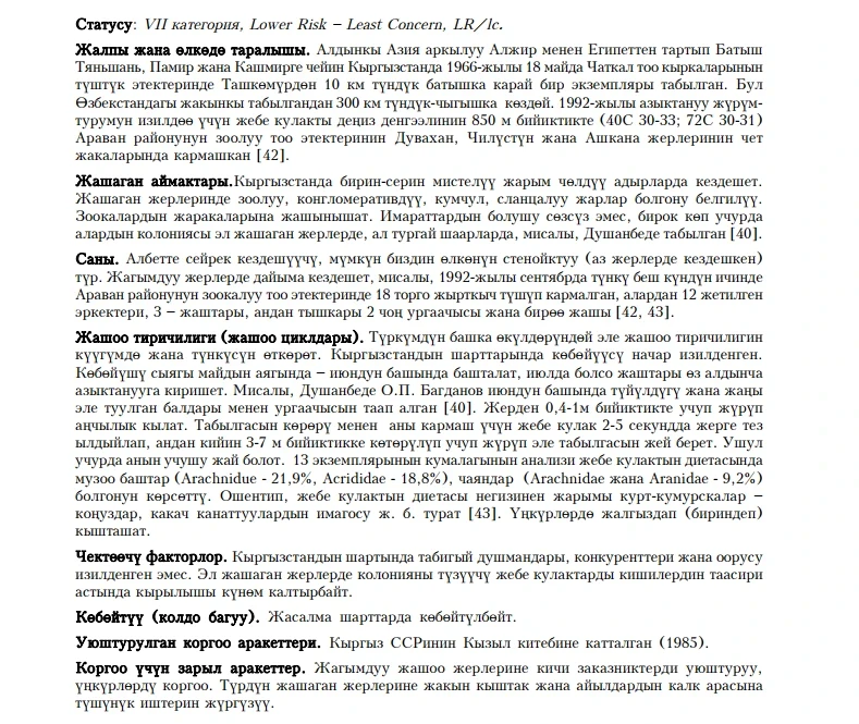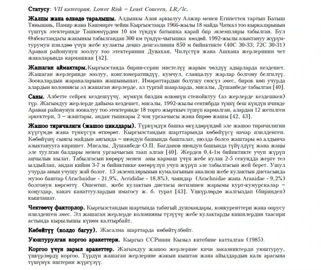 Status: VII category, «Lower Risk - Least Concern», LR/lc. This comparatively large (body length is 69 mm) light- coloured bat is very rare resident species in Kyrgyzstan. It is included in IUCN RLTS, locally distributed stenoeic west-south-Palaearctic (from Northern Africa up to Kashmir) representative of the monotypic relic genus. In Kyrgyzstan Desert Long-eared Bat was registered in southern spur of Chatkal Mountain Range (vicinity of Tash-Kumyr town) in 1966 and in vicinities of Aravan village in 1992, where it populates semi-desert slopes with sparse Pistachio forest; retreats are clefts in rocky, sandstone or schistose denudations. Bats hibernate one by one in loess caves, period of reproduction starts in May - June, young animals begin feeding on their own in July, males/females ratio is 5 in population examined (18 individuals captured per five nights, in pet habitat). These bats have specific hunt behaviour (low searching fly and catching at land surface), half of their prey consists of arachnids (scorpions, sun spiders, orb- web spiders), other half is insects (mainly acridids). Ecology and limiting factors are insufficiently studied in Kyrgyzstan, probably colonies in settlements are destructed by human. It is not held in captivity in Kyrgyzstan, special protection measures were not undertaken. For conservation of the species options offered are creation of micro-reservations in habitats and awareness building work for local people.