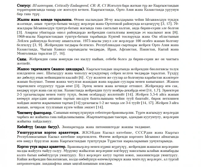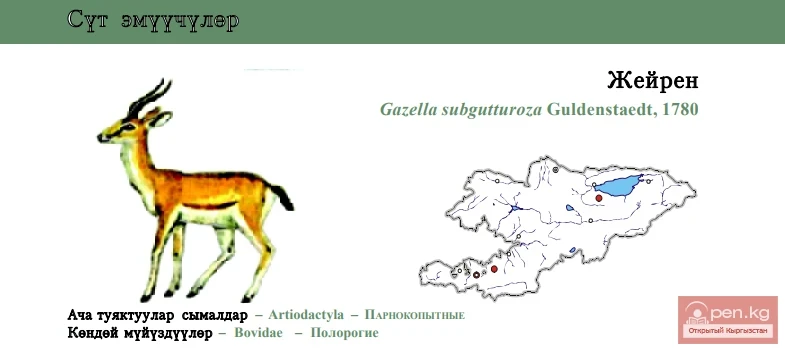 Status: III category, Critically Endangered, CR: R. Inhabited on northern and southern shores of western part of Issyk-Kul Lake as well as Orto-Tokoi and Leilek Locality in the south till 70th of the last century. No evidence of existence is available nowadays. No data on numbers are known. Prefers plain or hilled open habitats close to watered sites. Often limits water consumption with raining and snow water accumulated in depressions. Resident species. Feeds in mornings and evenings. Extremely shy animal with good sight and hearing abilities. Mating season starts in November-December. Males group 2-5 females and isolate them from other males. Pregnancy period is about 5.5-6 months, female give a birth to 1-2 rarer 3-4 young animals at the end of April till beginning of July. Lactation time lasts for 3 months. Limiting factors are poaching and cattle grazing. Breeds successfully in captivity. Included in Kyrgyz Red Book. It is recommended to fight against poachers, cease cattle breeding in suitable for Gazelle habitats, organize captivity breeding and re-introduction of the animal.
